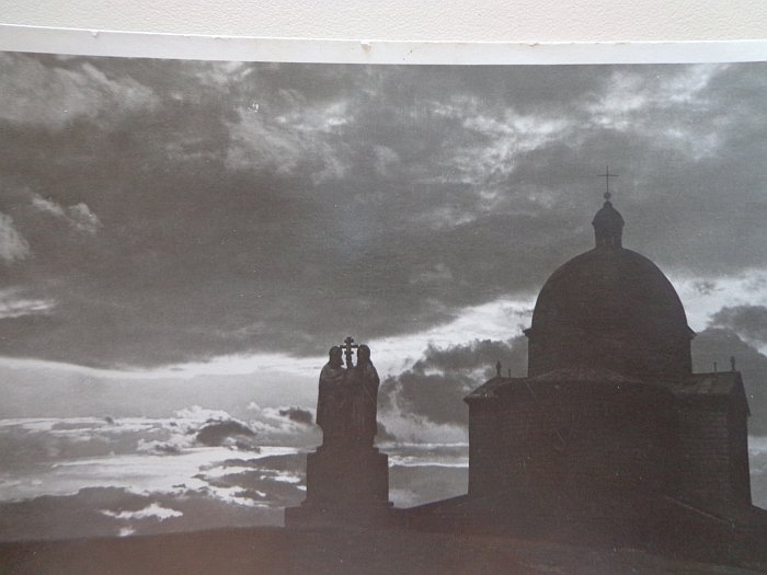 Řekne-li se Radhošť, znalým se v prvé řadě vybaví kaple na vrcholu hory, která je zasvěcena právě oněm bratřím. Pro ty, kdo na Radhošti nebyli, nabízím obrázek, který jsem našla ve svých pokladech a pokusila se jej připravit tak, aby na něm bylo aspoň něco vidět. Je to totiž fotografie vytvořená za večerního šera, takže silueta sousoší, která se nachází v těsné blízkosti kaple, je sice vidět, ale ne úplně jasně. Autorem tohoto sousoší je frenštátský rodák sochař Albín Polášek. Na podstavci sousoší je vytesán nápis "Spravedliví na věky jsou živí".