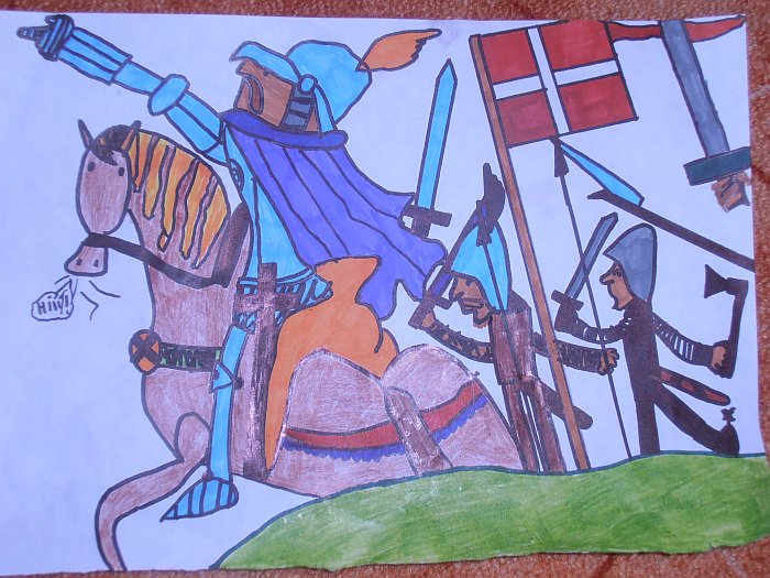 Když jsem si jednou jeho obrázky prohlížela, zároveň jsem se přesvědčila, že i důkladně při čtení naslouchal, neboť znal jeho přídomek "král železný a zlatý" a na dotaz o Janu Lucemburském přesně ocitoval jeho výrok, že "toho bohdá nebude, aby český král z boje utíkal" a ještě k tomu i dodal, že byl slepý. Děti jsou hodně zvídavé, a jestliže má dítě zájem, tak si leccos z toho, co jej zaujme, také pamatuje. Podotýkám, že ty dva obrázky nejsou jeho jediné výtvory. Když jej něco hodně zaujme, kreslí - hrady, zámky a různé další obrázky také podle vlastní fantazie.