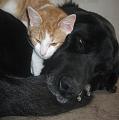 3. Žádná aranž není zmanipulovaná. Jsou-li kocouři např. na klíně, vlezli tam sami, i jeden na druhého. Stejně jako Oscar na Badyho, ten se k němu záhy tak tulil, že jsem černému psisku začala říkat "náhradní matek". Tím zůstává prakticky pořád, i když Ron už dávno seznal, že syn jeho péči nadále nepotřebuje ...