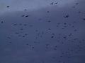 Sice se mi jich do objektivu nepodařilo zachytit, jak bych chtěla, protože jejich přelety jsou hodně rychlé a taktak jsem vždy stačila fotoaparát nasměrovat. Pár se mi jich podařilo pořídit - tak si to myslím - docela pěkných, tak se podívejte. Zajímavé je to hejno - sice trochu výše nad obzorem, ale ten útvar, jaký na nebi ptáci vytvořili, mě zaujal. Bylo to sice v době odletu havranů do svých nocovišť, jenže si nejsem jistá, jestli ten útvar je zrovna havraní, možná to jsou divoké husy - podívala jsem se do wikipedie a ten obrázek odpovídá jejich způsobu letu.