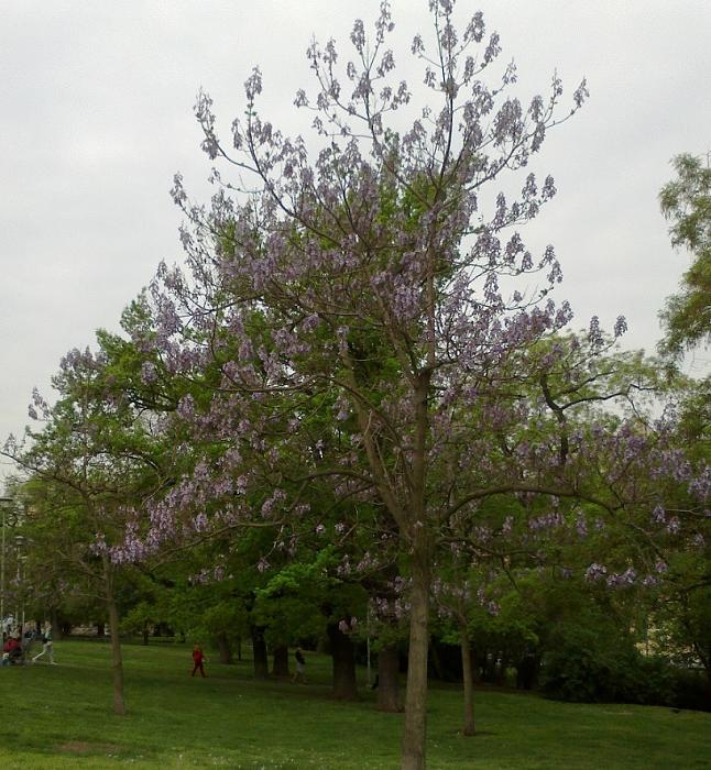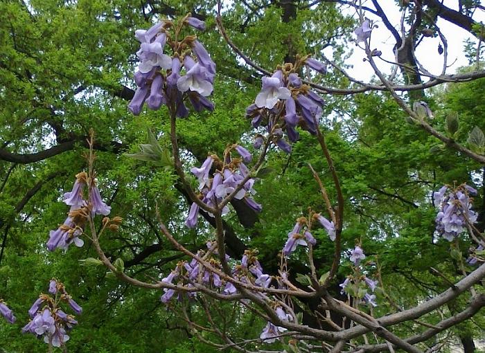 Do prvního zaměstnání jsem chodívala přes vnitroblok ve starší zástavbě. Byly tam kovové konstrukce na sušení prádla a jiné na klepání koberců, dětské pískoviště se dvěma lavičkami a kus trávníku, na němž rostl strom. Přes zimu na něm nebylo nic zajímavého. Během jednoho jarního víkendu však rozkvetl a já jsem v pondělí žasla nad tou krásou. Květenství sice připomínala kaštan, ovšem jednotlivé květy měly jiný tvar a hlavně – nezaměnitelnou světle fialovou barvu.