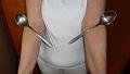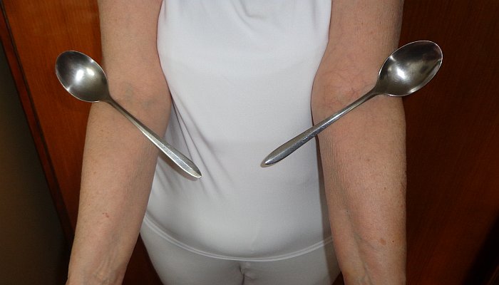 Zaujalo mě to, a tak jsem také zkusila přiložit si nerezové lžíce postupně do obou loketních jamek a byla jsem udivena, že to také fungovalo. Předvedla jsem to mému muži a přiměla jej, aby to zkusil také. Zkusil to a byli jsme oba překvapeni, co z toho nakonec vzniklo. Začali jsme také těmi loketními jamkami, postupně jsem mu pak přikládala na hruď další části příboru a nakonec i na čelo. Bylo to tak nějak podobně, jak to vypadá na přiložené fotografii, kterou jsme potom pořídili jednou později, když u příležitosti nějakého posezení přišla tahle zajímavost na přetřes.