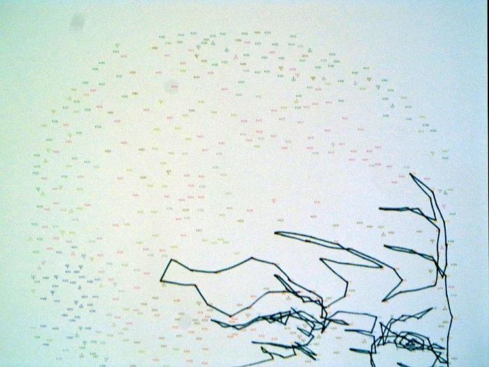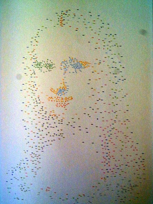 Z následujících tří fotografií je zřejmé, jak portrét vzniká. Na první fotografii je předloha, pouze tečky a čísla, některá uskupení čísel mají různobarevná zvýraznění. Jen pro úplnost - fotografie je podbarvená, ale předloha v originálu je vždy celá bílá.