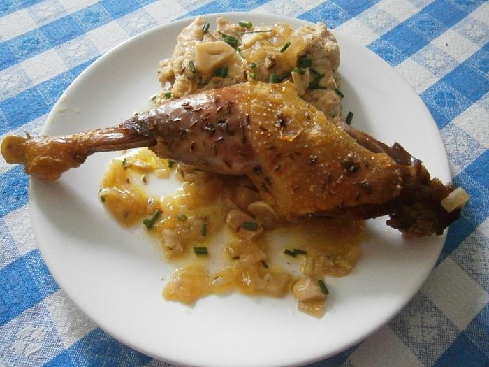 Slepice se švestkovou omáčkou – upeč slepici nebo kuřata. Vezmi švestky a dej je uvařit do vína. Potom je proceď, do té omáčky dej posekané slepice, vše okořeň hřebíčky, zázvorem a trochou šafránu a omasti sádlem.