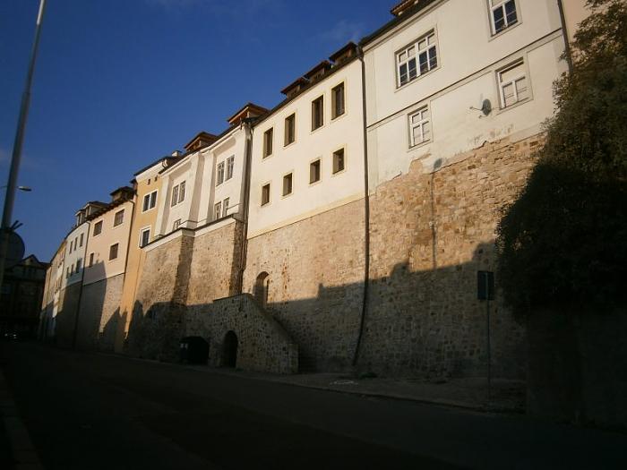 Domy na Staroměstském náměstí jsou patrové, kolem celého náměstí je stále podloubí. Budovy jsou dvojité, čelem do náměstí i nad svah ke Klenici nebo na Pták. Uličky vycházející z náměstí byly klikaté, chodníky hrbolaté. V domech zůstává starodávné rozdělení místností, tmavá a lomená schodiště, mázhaus (velká místnost) v přízemí nebo i v patře, hluboké sklepy často i o dvou patrech.