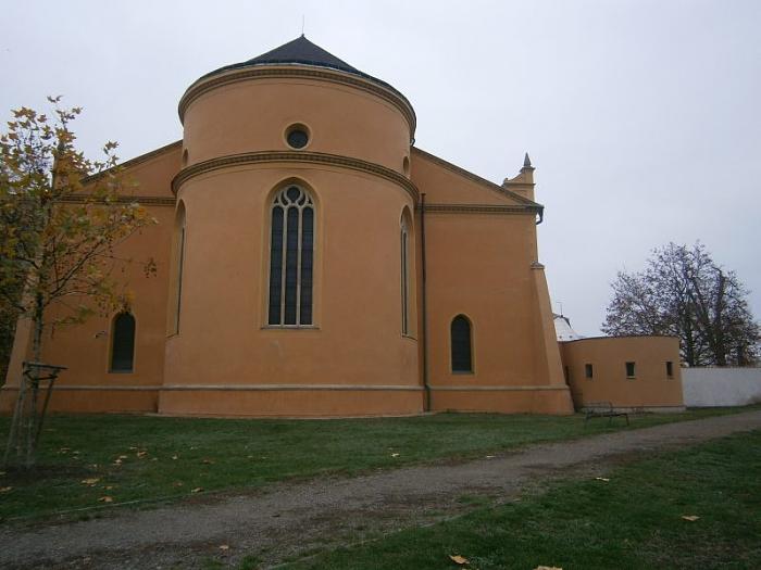 Hlavní prostor je zakončen polokruhovou apsidou. Tři vysoká lomená okna ukončená kružbami zasahují až do 1. patra, nad nimi jsou malá kulatá. V ozdobných kartuších se nacházejí biblické texty ve staročeštině psané gotickým i renesančním písmem. Na nich jsou ozdobně zavěšeny erby donátorů stavby. Byli jimi Adam z Krajku, Marta z Veselice, Alena z Šelmberka a Bohumil ze Zástřeza. Malby jsou velmi pěkné, prolínají se rostlinné i figurální motivy, mám vždy pocit, že na stěně jsou kancionály, které mají podobnou výzdobu. Erby šlechticů, kteří přispěli nemalou částkou na postavení stavby, jsou všem na očích, přímo ve středu dění.