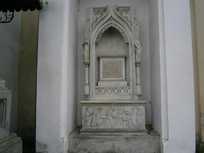 Ve výklenku pod věží kostela je umístěna kamenná stéla s baldachýnem, ve spodní části s reliéfem kladení Krista do hrobu. Náhrobek je od pražského sochaře Josefa Maxe z roku 1836, nápis ve střední části – Johan Franz Keeler in Henberg 1769-1836. Domnívám se, že zde leží Jan František Neuberk ml., syn Jana Františka st., který vydával české knihy a umožnil setkávání českých spisovatelů.