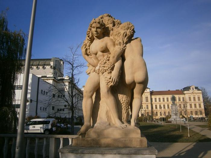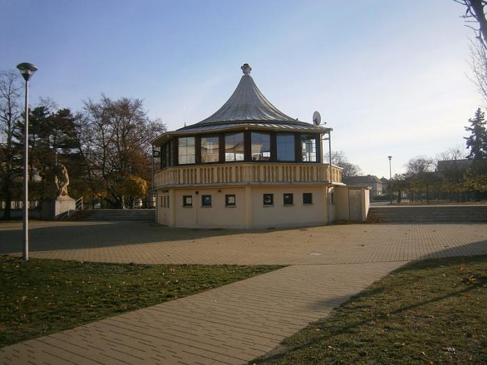 Ostravský výtvarník Vojtěch Sapík umístil po obou stranách pavilonu sousoší Tančící ženy, které sklidilo u části veřejnosti zaslouženou chválu, u druhé vzbudilo polemiku o vhodnosti námětu. Mnohým se nelíbily nahé tančící ženy ovinuté vinnou révou v místech, kudy chodí děti do škol. V tomto směru je zajímavé, že všechny pavilony zmizely, ale hudební altánek, i když v jiné podobě, a právě zmíněná sousoší zůstala na svých místech dodnes. Stále zdobí část areálu před reálkou, odděluje ho od pomníku J. A. Komenského.
