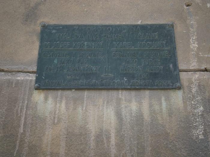Na Karla Krouského a jeho strýce Josefa Kořenského si vzpomněli v roce 1932 v krnském Sokole. Nechali připevnit pamětní desku na mlýně, z něhož vyšli, jak nám sděluje nápis. Karel je zde uveden jako redaktor a spisovatel, vůdce Národní gardy, Josef jako cestovatel a spisovatel, žák zdejší jednotřídky v roce 1854. Deska je na bývalém Podjiřském mlýně, přímo pod kostelem sv. Jiří a pod zámkem Stránov. Karel Krouský po určitou dobu vlastnil tento mlýn.