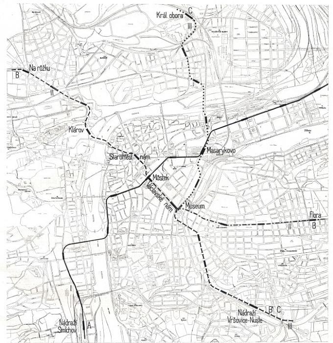 Nutno zdůraznit, že projekt počítal se třemi trasami metra, které byly označeny písmeny A, B a C a které vedly víceméně tak, jak je známe dnes: