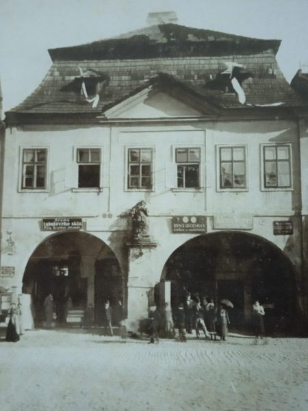 Do roku 1883 vlastnila dům rodina Engelova, po ní na dlouhá léta rodina Domalípova. Ta v roce 1890 zrušila podloubí, ale volné území zůstalo. Portálem se vcházelo do prostoru, který byl lemován prosklenými výlohami s krásně naaranžovaným zbožím. Teprve poté následoval vstup do prodejny.