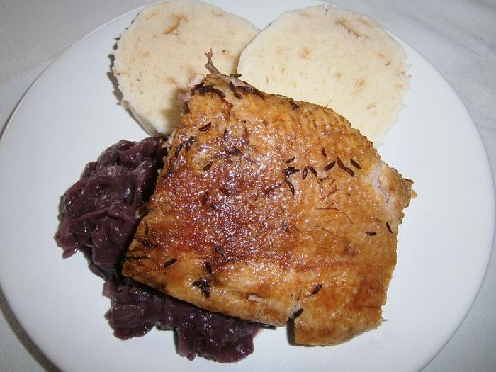 A knedlíky, bez nichž si neumíme pečenou husu dnes představit? Ty se objevily až v 17. století, byly z mouky, strouhanky nebo nakrájených rohlíků, se žloutky nebo vejci, s droždím i bez nich. Nepodávaly se jako příloha k masu, ale jedly se samostatně sypané osmaženou cibulkou, strouhaným tvarohem nebo s ovocným rozvarem. Zejména na Slovensku a na Moravě se k husám podávaly lokše, tenké bramborové placky, jenž se pokapaly husím sádlem.