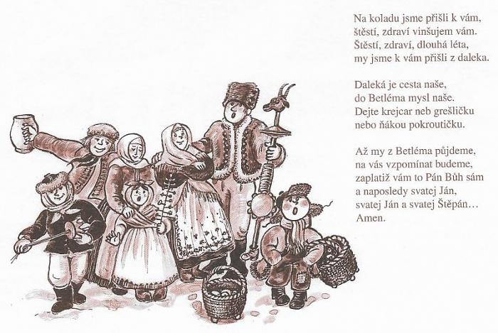 České koledy jsou laskavé, humorné a radostné. Jejich náplní je oslava narození Spasitele, poděkování Panně Marii, líčení výjevů biblického příběhu, život pastýřů i těžkosti koledníků. O obchůzkách s přenosným betlémem jsem se zmínila v díle o betlémech. Nyní dodám, že nosit na popruhu jesličky nebylo nic jednoduchého. Jejich váha nebyla jistě zanedbatelná, popruh také něco vážil, chlapci byli malí. Museli také dávat pozor, aby je cestou nerozbili.